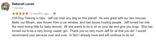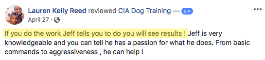 If you do the work Jeff tells you to do you will see results ! Jeff is very knowledgeable and you can tell he has a passion for what he does. From basic commands to aggressiveness, he can help!